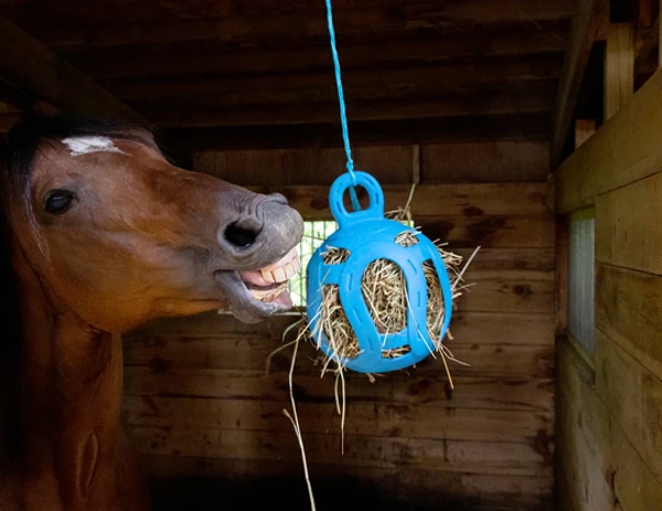De Jolly Hay Ball is eenvoudig op te hangen in stal, wei of trailer.