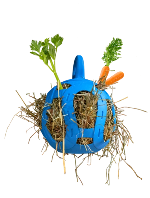 Vul de Jolly Hay Ball met hooi en vul de kleinere openingen met lekkers zoals appel of wortel. Zo is je paard wel even zoet.
